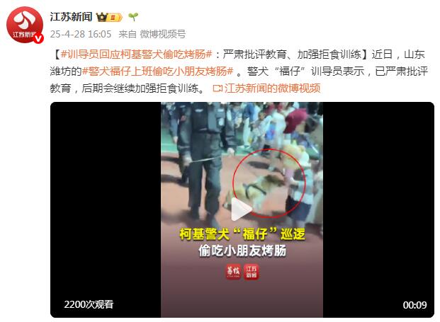 近日,山东潍坊的#警犬福仔上班偷吃小朋友烤肠# 。警犬“福仔”训导员表示,已严肃批评教育,后期会继续加强拒食训练。